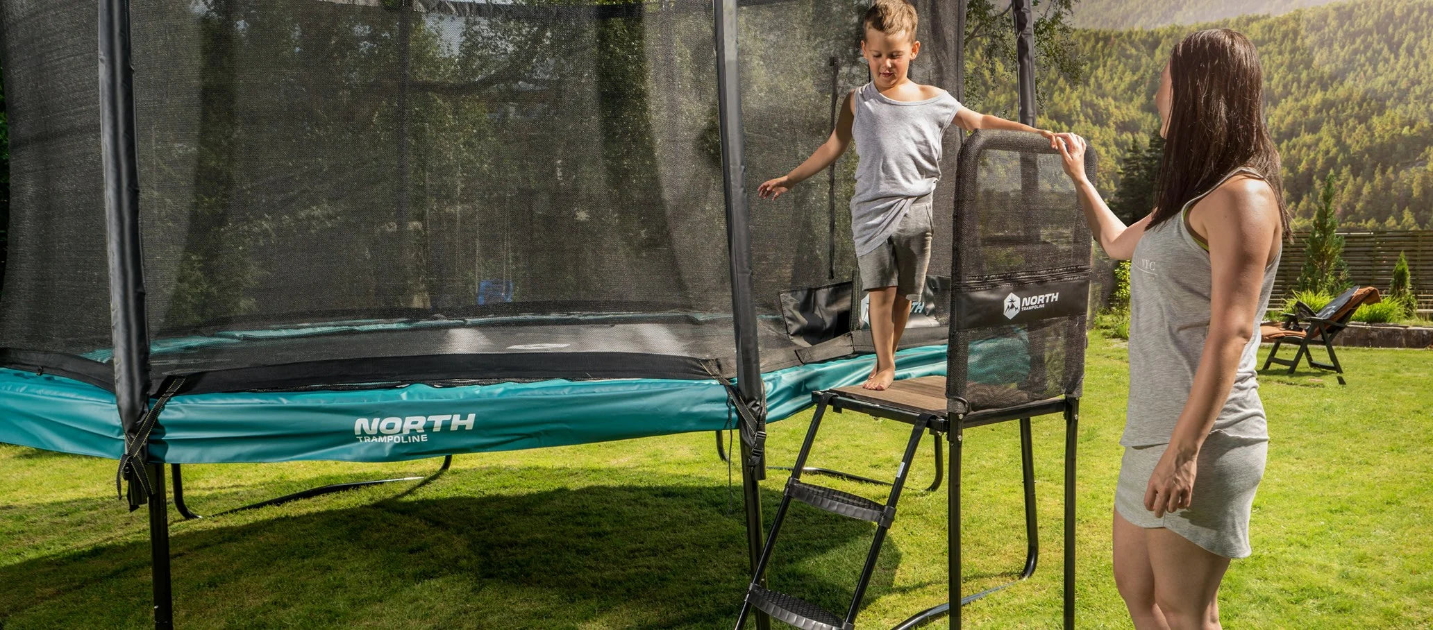 Die North Base Plattform erleichtert das Aufsteigen auf das Trampolin und macht es sicherer.